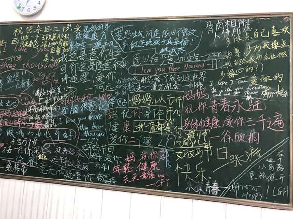 黑板上密密麻麻地写满了对母亲的祝福
