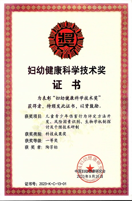 11月4日,第五届中国妇幼健康科技大会暨“妇幼健康科学技术奖”颁奖会在北京举行。由安徽医科大学公共卫生学院陶芳标教授牵头的研究成果“儿童青少年伤害行为评定方法开发、风险因素识别、生物学机制探讨及干预技术研制”,荣获全国妇幼健康科学技术奖科技成果奖一等奖。