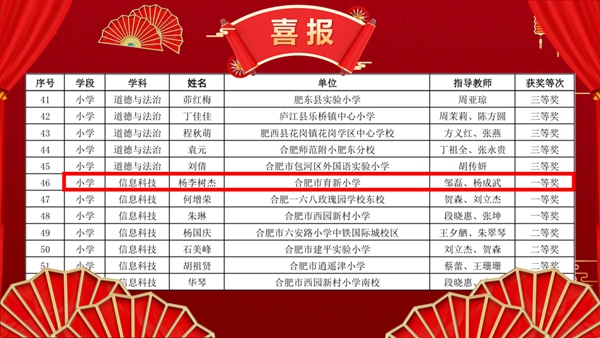 近日,2025年合肥市智慧教学创新活动评选结果揭晓,合肥市育新小学杨李树杰老师执教的课例荣获信息科技学科一等奖第一名,并被推荐代表合肥市参加省级比赛。