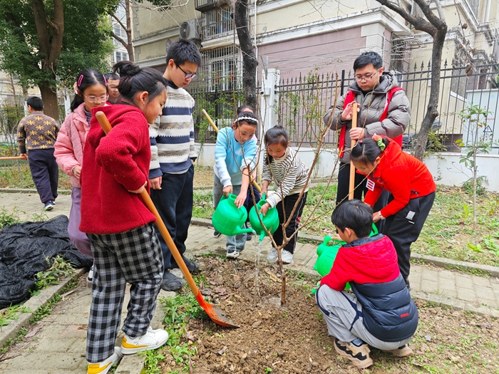 为践行绿色环保理念,深化校社协同育人实效,银杏苑校区与卫塘社区联合开展植树节志愿服务活动。师生代表、社区志愿者们分工协作,挥锹挖坑、扶苗培土、提水浇灌,以实际行动为校园添绿。此次活动将劳动教育、环保教育与社会实践有机结合,进一步拉近校社距离,形成家校社协同育人合力,助力学生在实践中成长。