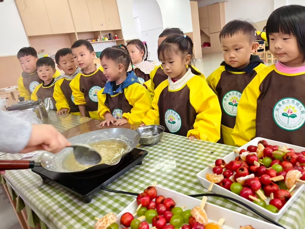 为了让孩子们最直接地体验立冬食俗,教师们精心创设了传统美食情境。茶席前,孩子们轻捧温热的红枣茶,在袅袅茶香中感受“围炉煮茶”的冬日雅趣;随后,一串串晶莹剔透的冰糖葫芦,为他们带来了属于冬日的首份甜蜜。这场以味蕾为引的节气之旅,不仅温暖了身心,更让立冬的文化内涵随着食物的滋味,深深浸润了童心。