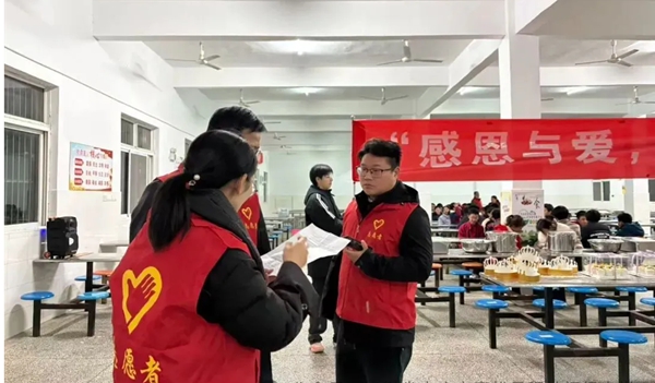 活动开始后,志愿者们的“守护”更显用心:在食堂门口,他们维持秩序,引导学生们轻声慢步、安静落座;看到有低年级学生紧张,志愿者主动上前安抚:“别怕,这是属于你的特别时刻!”当家长与孩子拥抱时,旁边的志愿者悄悄按下快门,记录下一个个感人的瞬间;活动结束后,他们又化身“引导员”,协助家长与学生前往就餐区,并提醒“小心地滑”。