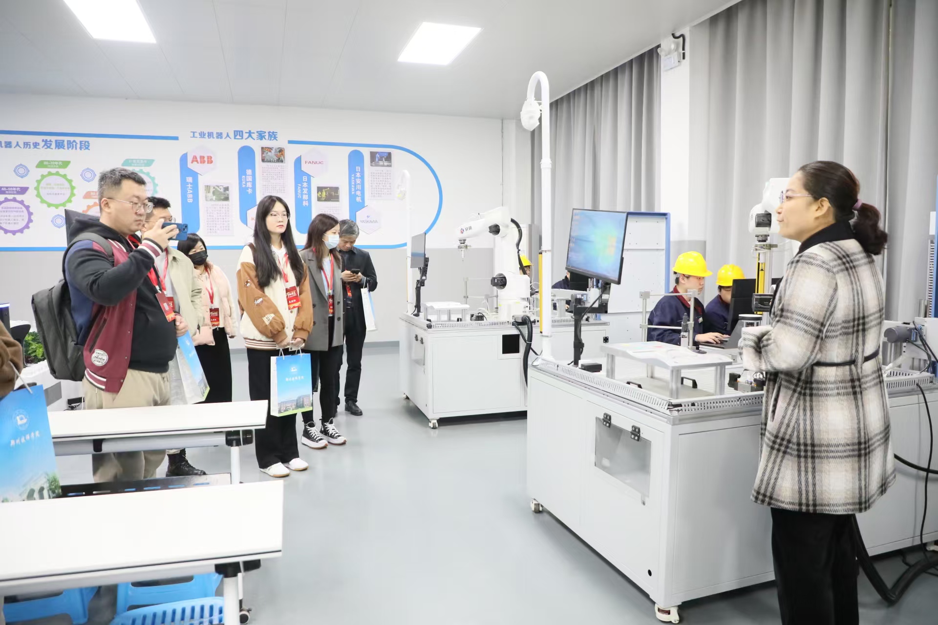 而在位于该校实习教学楼的工业机器人实训教室里,头戴安全帽的学生通过转动按钮操作着机械臂的夹抓,使其根据不同的颜色和形状自动识别,并完成相应的任务。