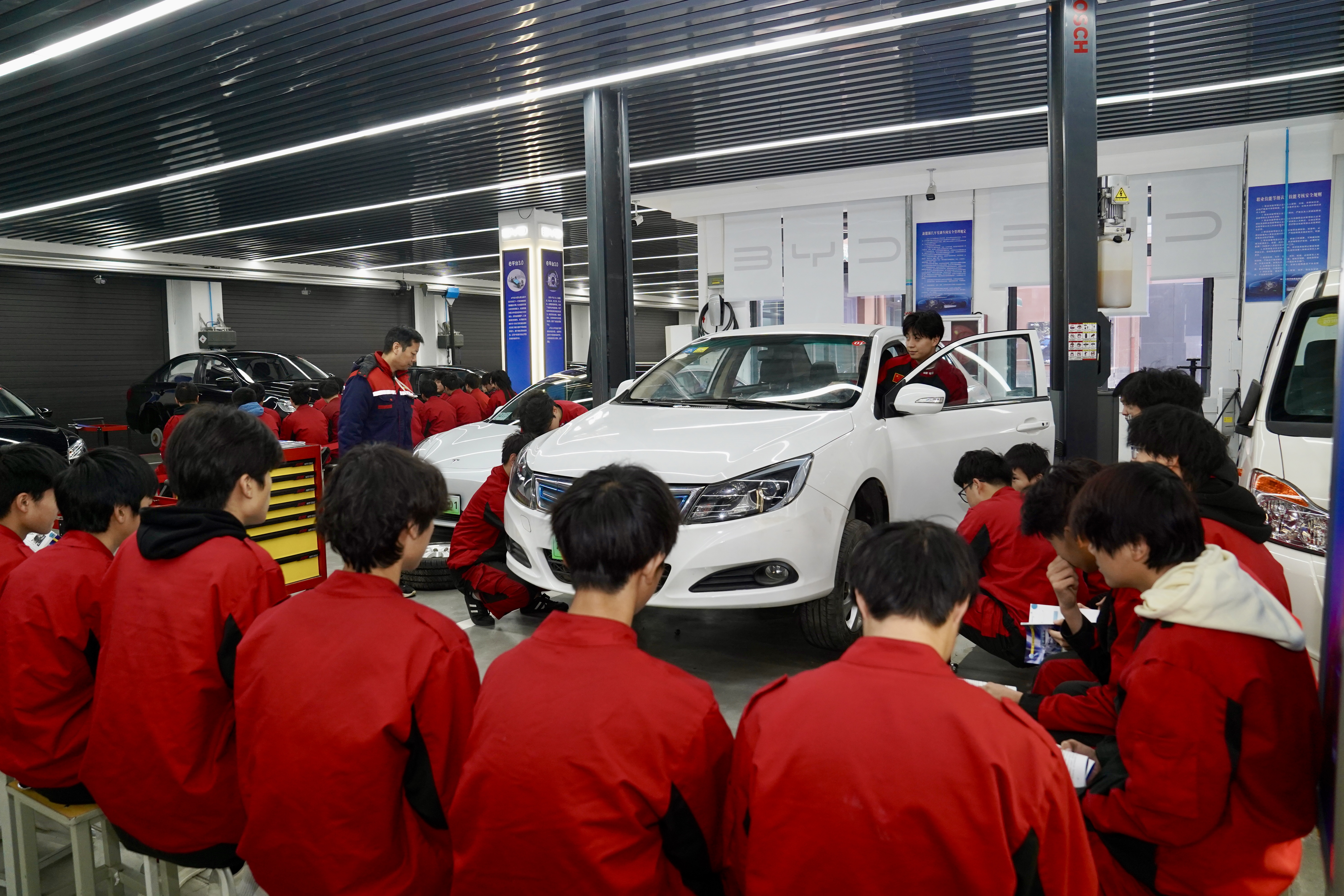 “比亚迪工匠学院从氛围营造、到基础设施,从理论教室、到训练场地,力求规范化、专业化。”罗荣告诉记者,该学院投入整车实训车辆30余台,实训教室26个,标准化实训工位3个,全力满足学生专业学习、实操训练需求。