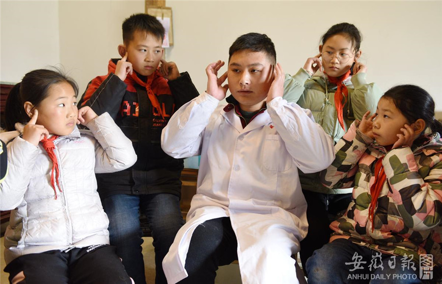 2月28日,在含山县仙踪镇石婆大欧村留守儿童之家,姚庙卫生院的医护志愿者在给留守儿童讲解耳朵的构造、功能,并教耳保健操。当日,含山县姚庙卫生院的医护志愿者走进大欧村留守儿童之家,通过耳保健操、耳朵解剖图,让留守儿童们了解耳朵的构造、功能,还教耳保健操,增强他们爱耳护耳的意识,提高自我保护能力。据悉,3月3日是全国第22个爱耳日,今年的爱耳日主题是:人人享有听力健康。通讯员 欧宗涛 唐超