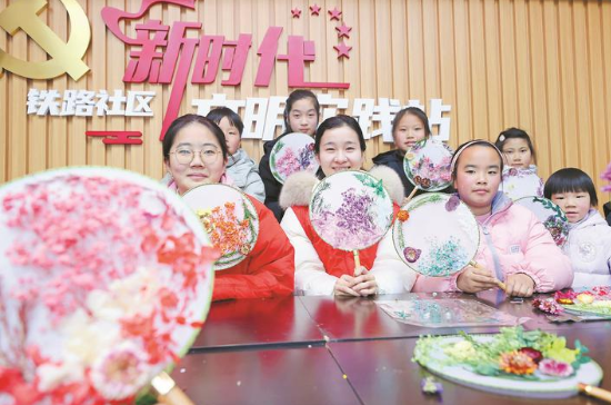 2月8日,在相山区东街道铁路社区,志愿者与孩子们共同制作团扇作品。