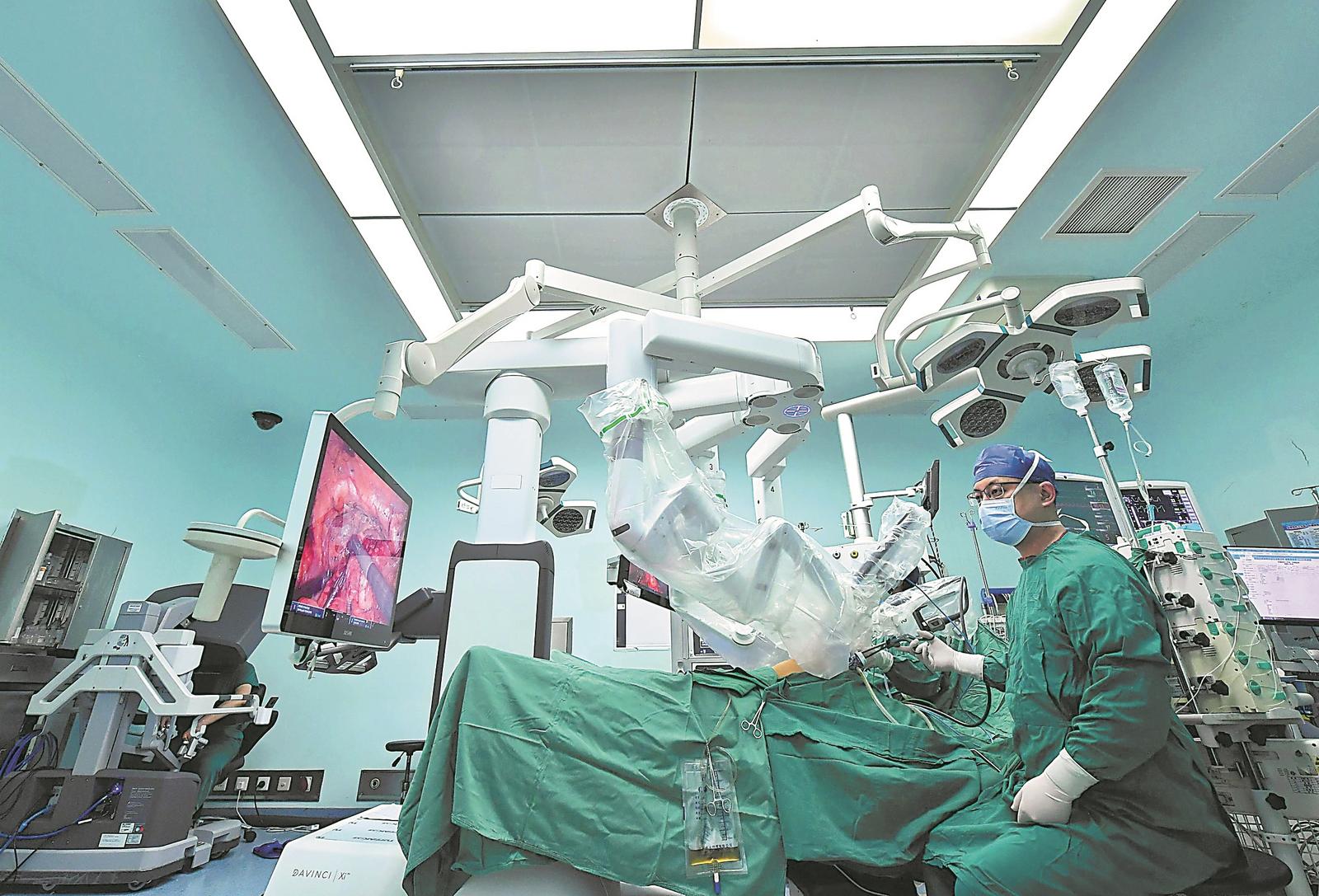 3月4日,安医大一附院手术室里,医生操作手术机器人为患者开展治疗。记者 程兆 摄
