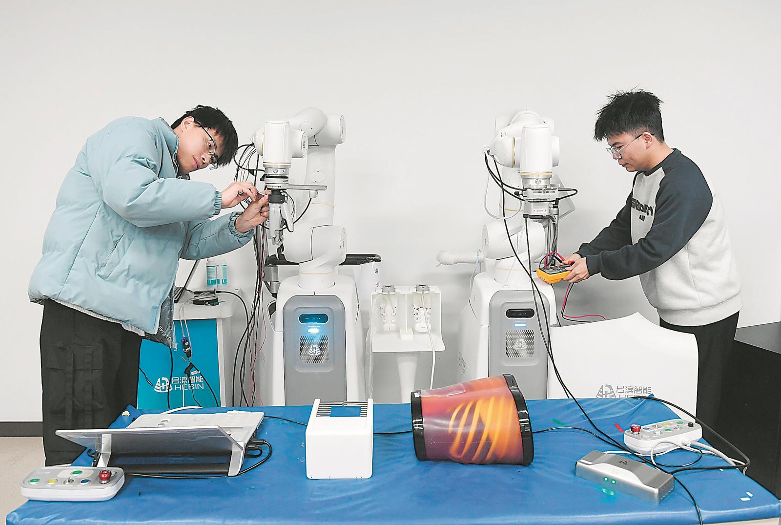 近日,位于合肥市包河区的合肥合滨智能机器人有限公司内,科研人员正在研发具身智能超声机器人原型机。该机器人原型机可应用于医疗和养老机构,解决超声领域求医难的问题。记者 徐旻昊 摄