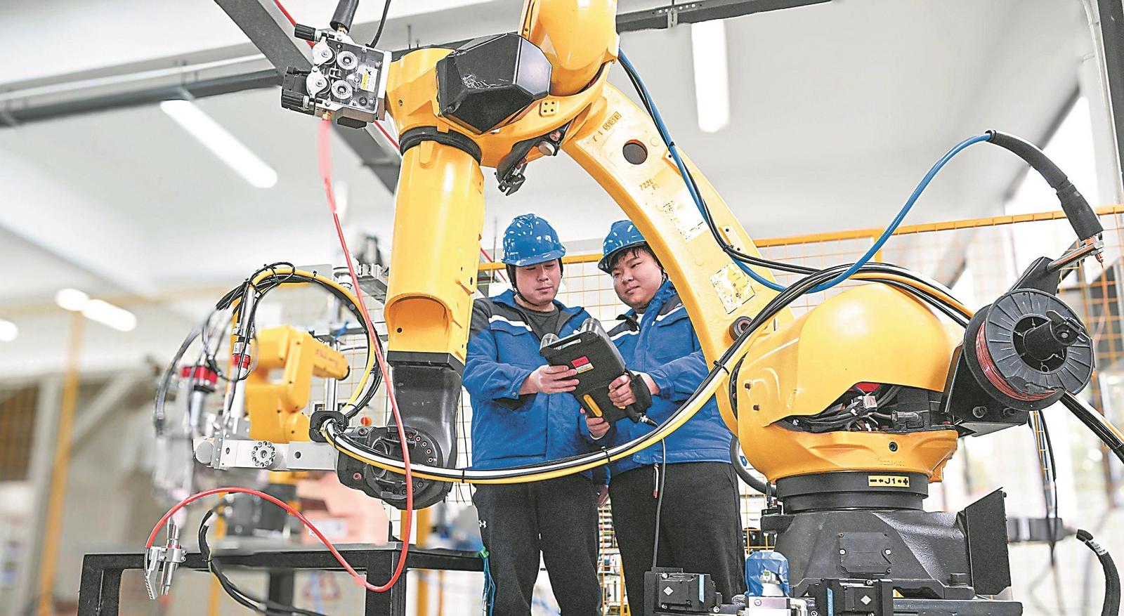3月3日,在安徽斯塔克机器人有限公司生产车间内,技术人员正在调试激光切割机器人。记者 李博 通讯员 王文生 摄