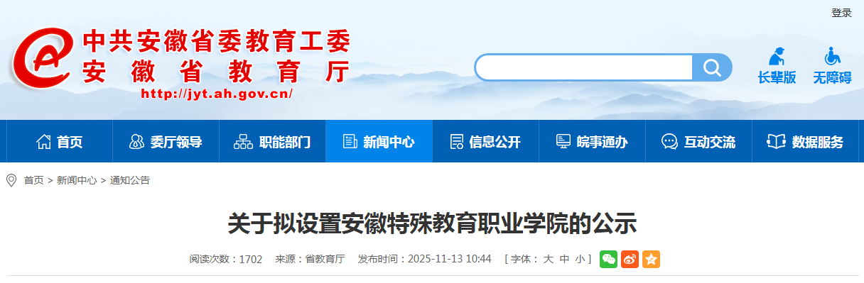 11月13日,安徽省教育厅发布《关于拟设置3所本科层次职业学校的公示》《关于拟设置安徽特殊教育职业学院的公示》。
